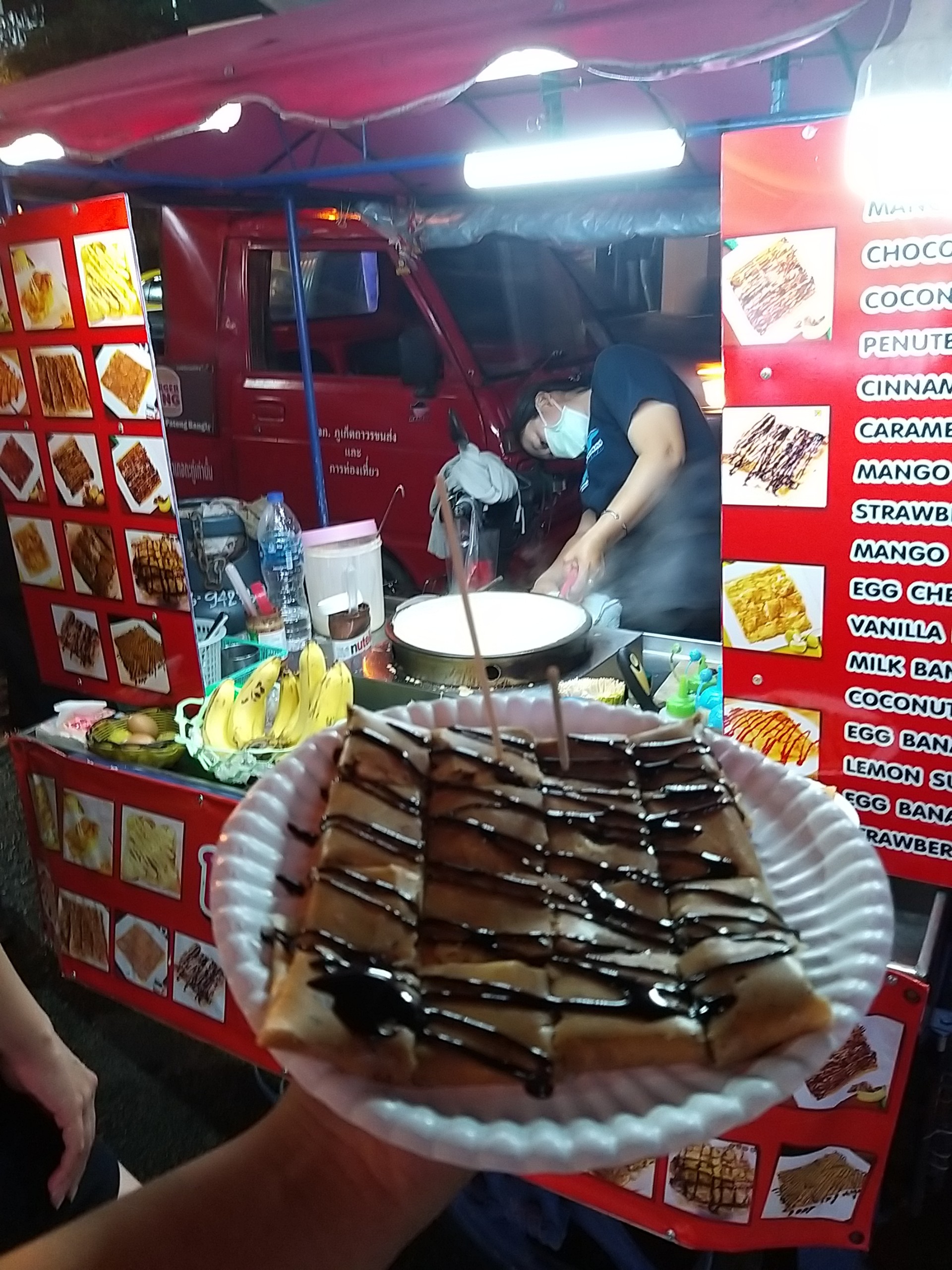 첫 번째 바나나 팬케익은 워킹스트리트 내에서 사먹었는데 가격이 다소 비싸서 차마 초콜릿을 추가하지 못하고 그냥 초콜릿 없는 바나나 팬케익을 먹었고 두번 째는 바나나 팬케익은 팬케익인데 크레페를 만드는 식으로 짝퉁으로 만들어 파는 곳에서 구매해서 비주얼이 딱 봐도 퍽퍽해 보인다. 실제로 맛도 그렇다.