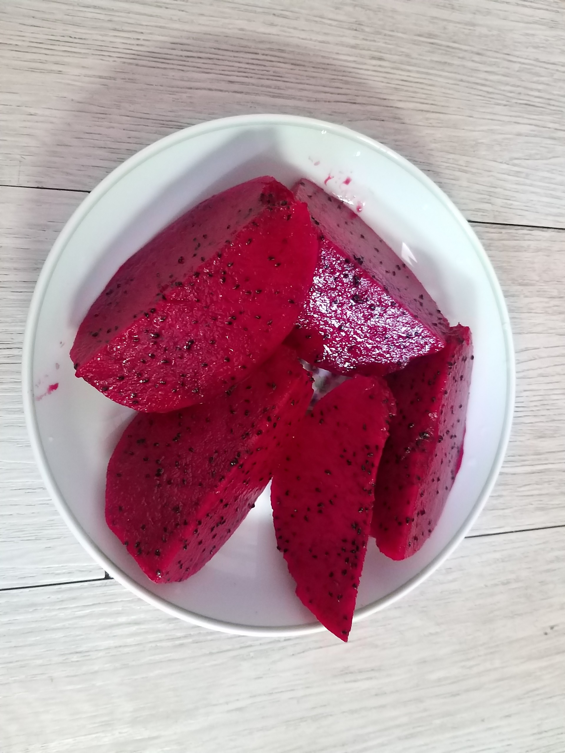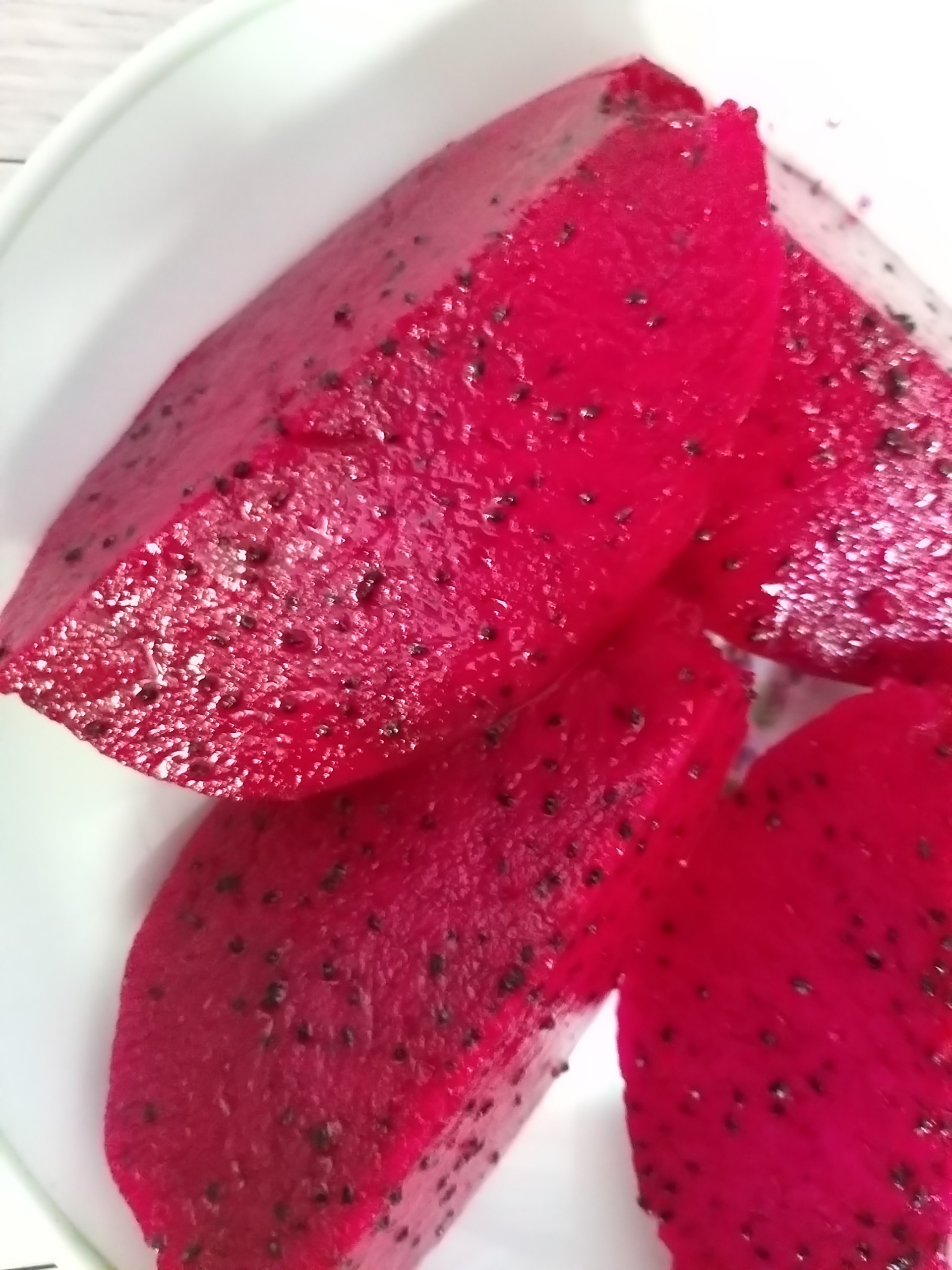 그래도 혹시나 시도해보고 싶다면 한 번 정도만 호기심에 시도해 보시고 붉은색 용과를 주로 먹기 바란다. 가격도 적당하고 달기도 정말 단 편이다. 붉은색 용과 과육의 모습은 아래 사진을 참고하면 된다. 내가 직접 잘라서 먹은 사진.